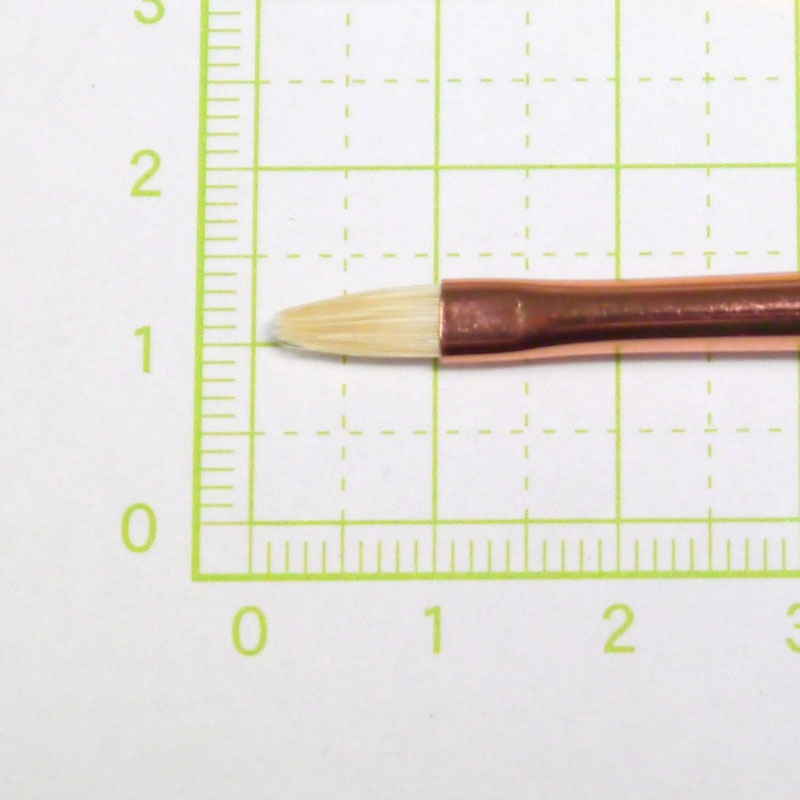 口金幅(約):4mm。毛の種類:豚毛。油筆の中で代表的な毛です。硬毛で弾力性、復元性に優れています。やや短毛で厚みがあります。円頭平型は使い慣れてきた筆の形。使い安い豚毛の最高級品です。口金は真鍮胴メッキで、使っていくうちに銅が酸化して、反射光を和らげる効果に配慮しました。日本製。
