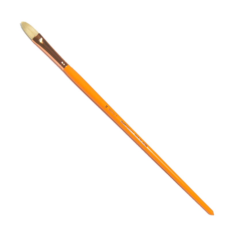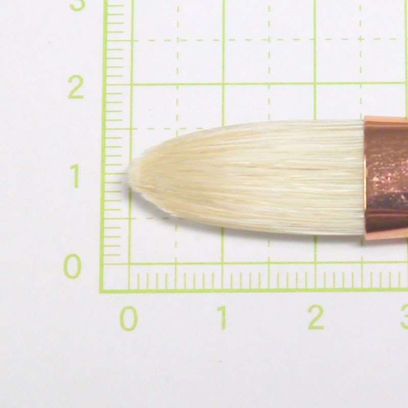 口金幅(約):13.5mm。毛の種類:豚毛。油筆の中で代表的な毛です。硬毛で弾力性、復元性に優れています。やや短毛で厚みがあります。円頭平型は使い慣れてきた筆の形。使い安い豚毛の最高級品です。口金は真鍮胴メッキで、使っていくうちに銅が酸化して、反射光を和らげる効果に配慮しました。日本製。