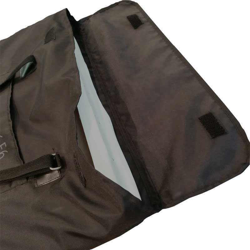軽くて丈夫で、キャンバス2枚がゆったり入ります。フタ付きの実用本位で無駄がありません。スケッチブックと水彩用品を入れて持ち運んだり、折りたたむとポシェットにも入るくらい小さくなるので色々な用途に使えます。ベルトの長さ調整可。防水加工ナイロン製。色:黒 寸法:49×40×6㎝。日本製。