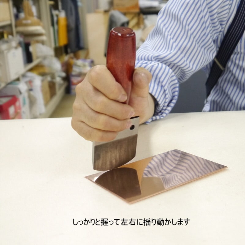 先端を版面に押し当てて左右に揺り動かし、細かい点状のまくれを作ります。