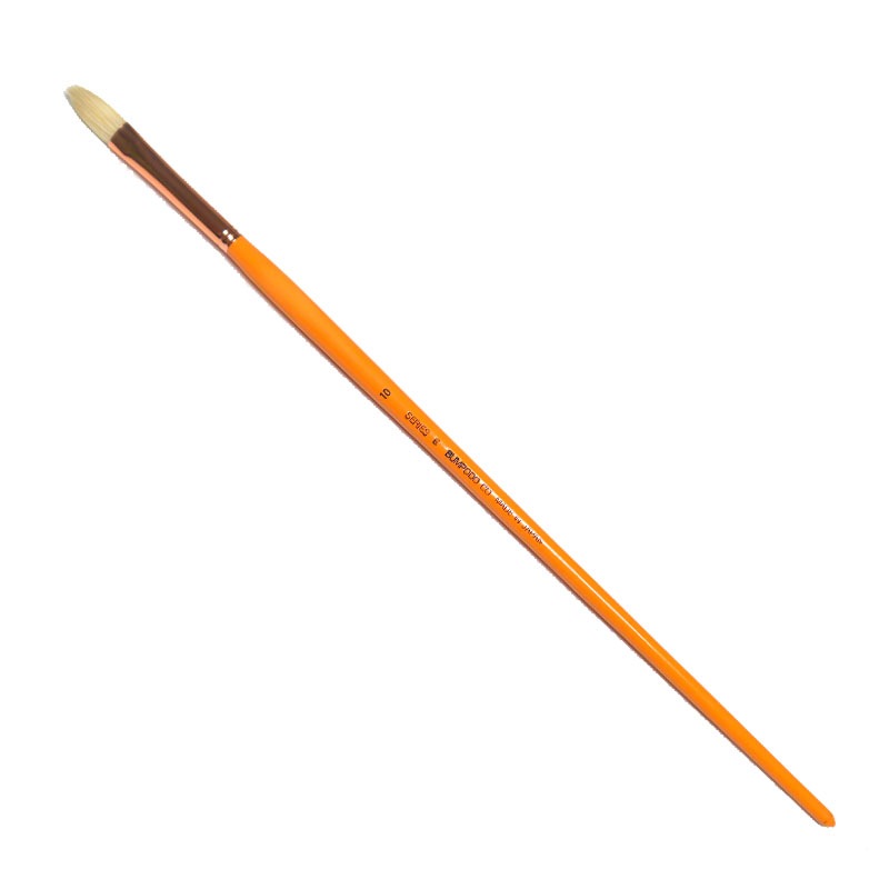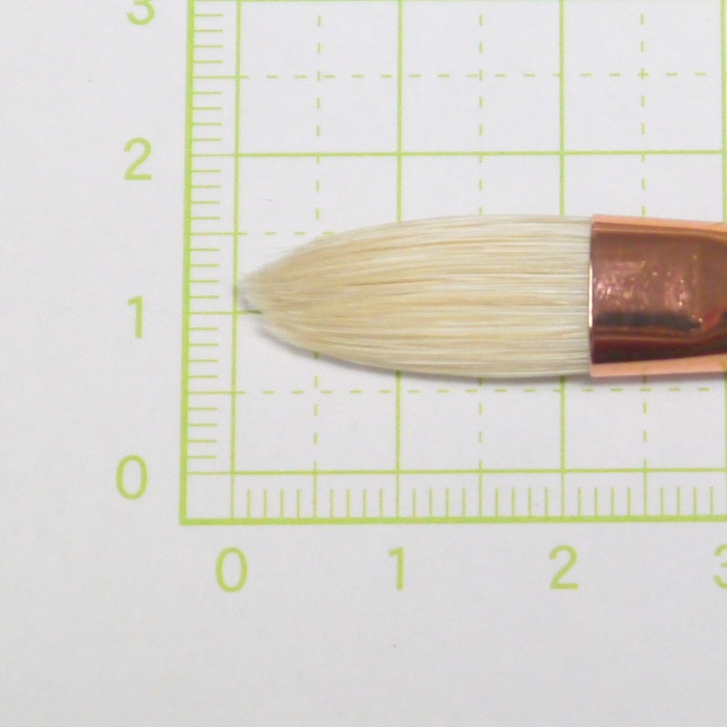 口金幅(約):10mm。毛の種類:豚毛。油筆の中で代表的な毛です。硬毛で弾力性、復元性に優れています。やや短毛で厚みがあります。円頭平型は使い慣れてきた筆の形。使い安い豚毛の最高級品です。口金は真鍮胴メッキで、使っていくうちに銅が酸化して、反射光を和らげる効果に配慮しました。日本製。