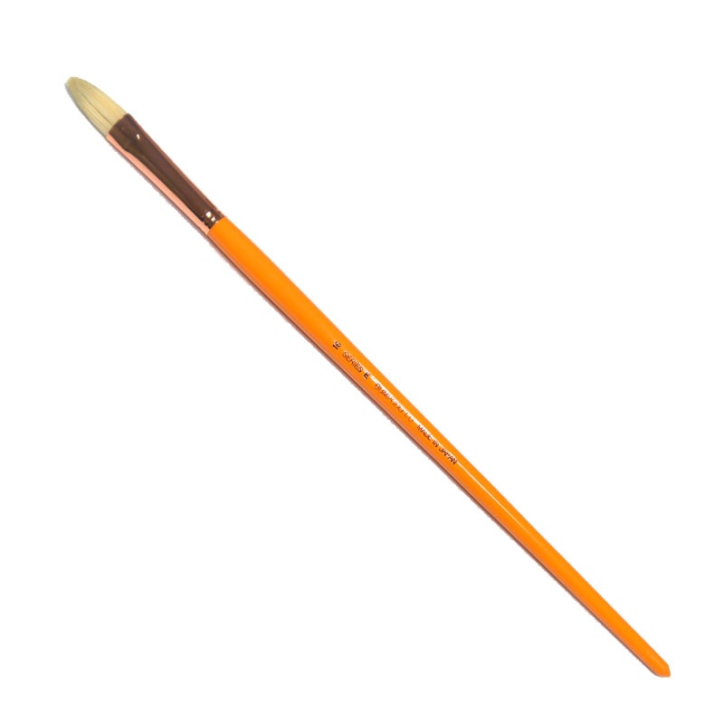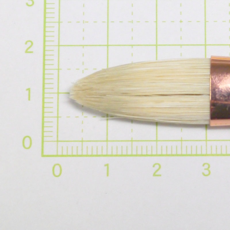 口金幅(約):15mm。毛の種類:豚毛。油筆の中で代表的な毛です。硬毛で弾力性、復元性に優れています。やや短毛で厚みがあります。円頭平型は使い慣れてきた筆の形。使い安い豚毛の最高級品です。口金は真鍮胴メッキで、使っていくうちに銅が酸化して、反射光を和らげる効果に配慮しました。日本製。